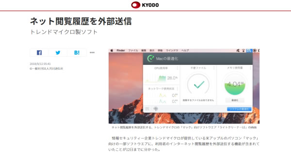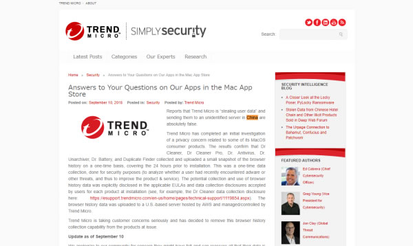 Mac向けの(トレンドマイクロとは関係のない)Adware Doctorというアプリが、ユーザーのブラウザ履歴を収集し、中国のサーバーへ送っているのが発覚。