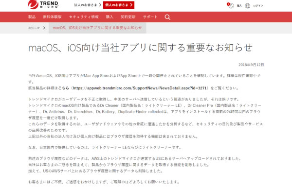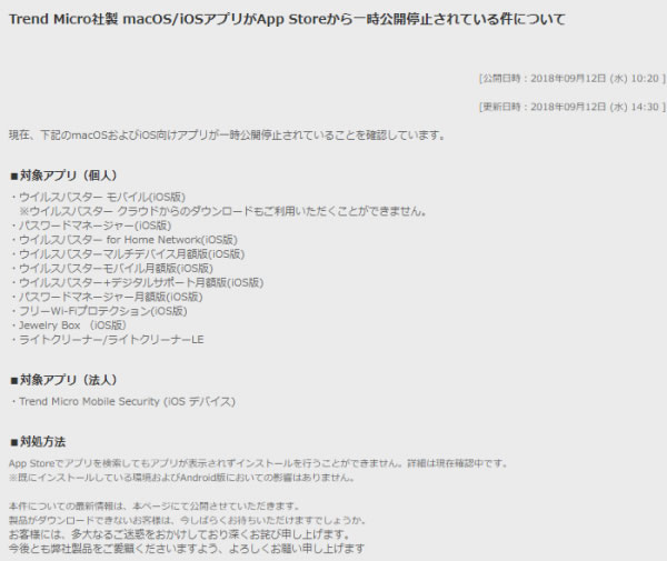 2018年9月12日、トレンドマイクロ製 Mac OS / iOSアプリがApp Storeから一時公開停止になる。対象アプリは次の通り。